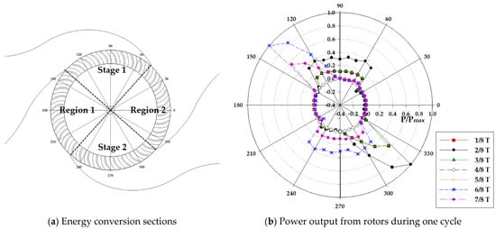 The turbine power generation on the rotor during one period (Φ = 0.67) is illustrated in Figure 9b. The large amount of power generation was captured in 2/8T and 7/8T periods that the fastest airflow comes from the nozzle. At the beginning of the period, the large energy conversion occurred first at the entire blades in stage 1, and the rest of energy transfer was observed partial at the blades in stage 2. The peak power was mainly acquired at the second stages. Most of energy loss during the period was obtained at regions 1 and 2 as presented in Figure 9b. The retreating flow from main cross-flow entered anti-directional to the rotating blades of regions 1 and 2, which caused minor negative power.
