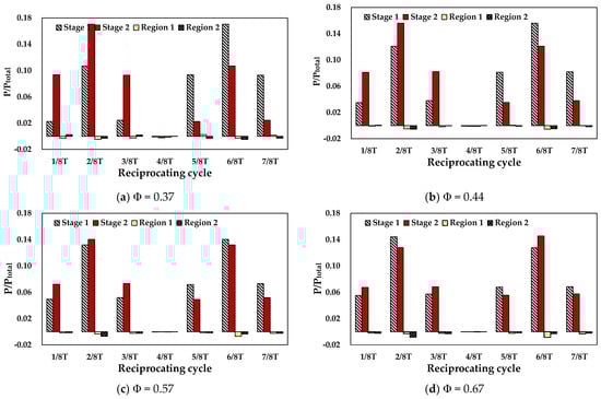 For different flow rates with the same piston displacement, the non-dimensional variation of turbine power output is represented in Figure 10. The majority of energy generation was obtained at second stage of the rotor. The accelerated cross-flow after the first stage with higher kinematic energy was converted at the second stage. However, more energy conversion was acquired at 2/8T of Φ = 0.67 when the incoming flow was significantly high enough to impart its high kinematic energy to the first stage of the rotor. Although the energy loss at regions 1 and 2 tended to increase as the flow coefficient increased, the amount was too minor to affect the turbine performance.