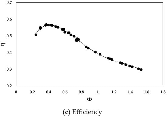 The cycle-averaged turbine performance in reciprocating air flows is represented in Figure 11. The upward trend of both pressure and torque coefficients is illustrated with a trendline as shown in Figure 11a,b. The coefficients of pressure and torque were well fitted to the trendlines with 0.99 of , which is the coefficient of determination. The maximum efficiency of the turbine in reciprocating flows was 0.568 at Φ = 0.37. High efficiencies were mainly observed at low flow coefficients, which is due to the low displacement of piston movement inside the air chamber.