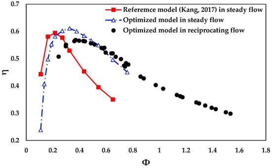 - The optimized model in reciprocating flows had more improved operating range with higher efficiency than the steady-state performance, but the peak performance decreased by 4.3%.