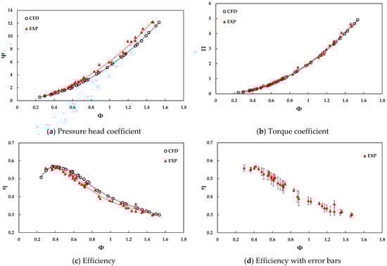 The comparison between numerical and experimental results is illustrated in Figure 13. The numerical dimensionless pressure coefficient had great agreement with the experimental result at a low flow coefficient, but then the gap between those two became significantly larger with an increase in the flow coefficient. However, the numerical curve of the torque coefficient matched well with the experimental result as shown in Figure 13b. The averaged and peak differences in cycle-averaged turbine performance were 3.5% and 8.8%, respectively. Generally, the numerical model agreed well with the experimental results, and this demonstrates that the numerical model has excellent capability to predict the unsteady performance of the cross-flow air turbine in various further conditions.