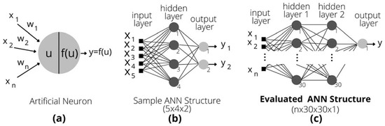 ANN model: (a) an artificial neuron, (b) example of ANN structure and (c) the ANN structure applied in this study.