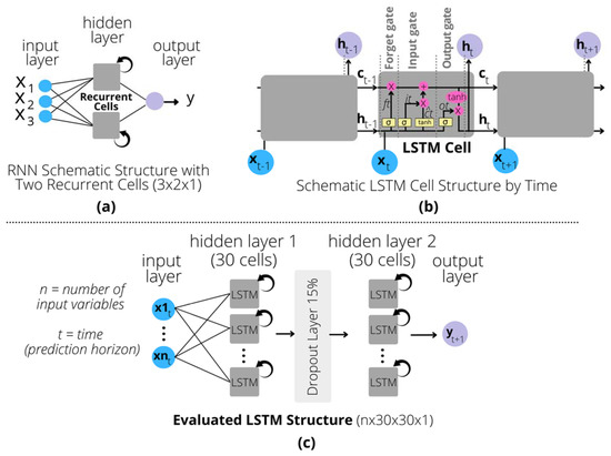 A number of architectural variations of LSTM cells and networks have been proposed and applied in the literature [60]. The internal schematic diagram of an LSTM cell used in this study is shown in Figure 2b. Considering that W represents a weight and t is the current time, we have: