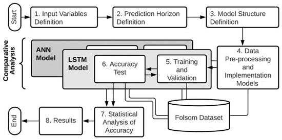 The experimental setup of this study was designed to evaluate the prediction accuracy between the ANN (Figure 1c) and LSTM (Figure 2c) models, which are supervised learning algorithms and require prior iterative training to obtain the optimal weights and biases [20,21]. The overview of the experimental method, components, flow and execution steps is presented in Figure 3.