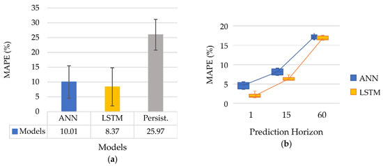 To identify the prediction model with the best overall accuracy, the mean and standard deviation values of the prediction accuracy were grouped by ANN (Figure 1c) and LSTM (Figure 2c) and persistence models. The overall average prediction accuracy performance (MAPE) of all models is displayed in Figure 4. The ANN and LSTM models outperformed the baseline persistence model. Therefore, the comparative analyses are mainly focused on both ANN and LSTM models. When comparing all samples for each ANN and LSTM model, it is observed that, overall, LSTM demonstrated better accuracy compared to ANN, having a difference in the MAPE average of 19.50%, which was therefore lower for the LSTM model (Figure 4a).