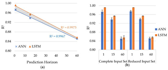The mean accuracy of the ANN and LSTM models for each prediction horizon can be observed by means of the coefficient of determination (R²) (Figure 5). The ANN and LSTM models present similar results, with the accuracy decreasing as the prediction horizon increases (Figure 5a). Furthermore, the regression lines of the ANN and LSTM models show that the difference in accuracy between the two models decreases as the horizon increases, that is, there is a greater absolute difference between the models for the 1 min horizon. This result was similarly observed in the two input variable sets presented in Figure 5b.