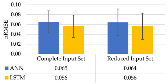 In order to validate the results and comparisons between all pairs of models and prediction horizons, it was established as a Null Hypothesis (H0) that the performances of ANN and LSTM models are equal, in terms of accuracy, considering the nRMSE metric. Therefore, the repeated measures ANOVA statistical test [72] was employed to validate H0. It should be noted that the repeated measures ANOVA statistical test was applied because the means are composed of the results of three-fold (3-fold) cross-validation.