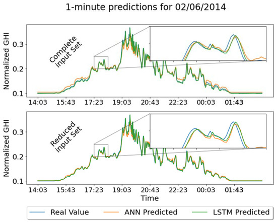 This section presents the results from the performed experimental method defined in Figure 3. The results regarding the prediction accuracy and errors of all ANN, LSTM and baseline models are summarized in Table 6. The experimental method (Figure 3) was performed twice for the two input sets with different exogenous meteorological variables: the Complete Input Set has 10 inputs (seven exogenous) and the Reduced Input Set has six inputs (three exogenous). For each input set, the prediction accuracies of ANN and LSTM at the 1, 15 and 60 min horizons were evaluated.