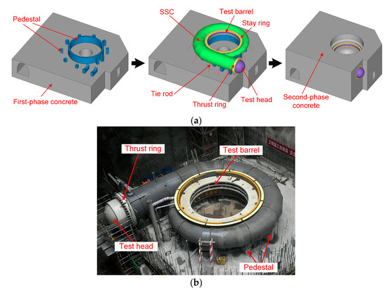 In modern engineering practices, P-type SCSs are adopted in most PSPPs for its abundant engineering examples [12]. The standard construction process of P-type SCSs and an in-field scene of it are shown in Figure 1. The first-phase concrete and pedestal of the SSC are constructed previously to provide necessary support for the SSC. Then, the SSC is placed in position and sealed with the test head and test barrel. The test head is set at the inlet of the SSC, and the test barrel is set between the upper and lower stay rings. Meanwhile, the SSC is fixed to the concrete with tie rods around it to prevent the uplift of SSC during the construction of the second-phase concrete. Then, temporary internal water pressure (IWP) is specified in the SSC, and second-phase concrete is constructed with the SSC under pressurized condition. Finally, after the set of second-phase concrete, the temporary IWP is released, the sealing devices are removed and the construction of a P-type SCS is, thus, finished.