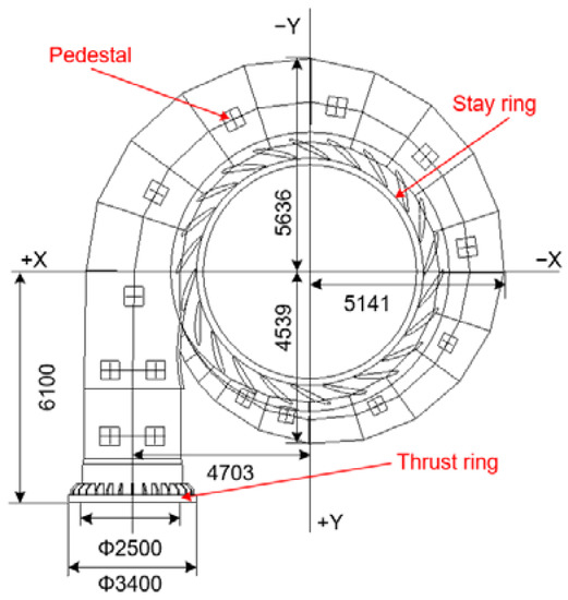 However, it is striking that the unbalanced thrust shared by the stay ring reaches 7.19 MN under this condition. That is to say that, contrary to common knowledge, the stay ring actually shares a certain part of the unbalanced hydraulic thrust, and it cannot be ignored. Accordingly, the reliability assessment of the connection between the stay ring and its supporting concrete is, thus, suggested for structural safety.