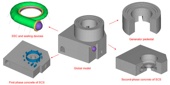 The numerical study is based on the ABAQUS software. Figure 4 shows the FE model of the SCS, with part of the generator pedestal taken into consideration. The concrete, the thrust ring and the stay ring are modeled with C3D8 solid elements. The SSC, the test head, the internal steel liners of the generator pedestal and the draft tube and the fixed guide vanes of the stay ring are modeled with S4 shell elements. The tie rod is modeled with T3D2 truss elements. The consistent deformation of the SSC and the internal surface of the concrete during the construction process is simulated with CONN3D2 connector elements [20]. The model consists of 76,732 nodes and 116,383 elements. The typical element edge length is 0.1–0.75 m.