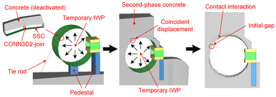 - After the set of second-phase concrete, deactivate the connector elements and activate the contact mechanism of the SSC and the concrete. Then, release the temporary IWP to simulate the formation of the initial gap between the SSC and the concrete.