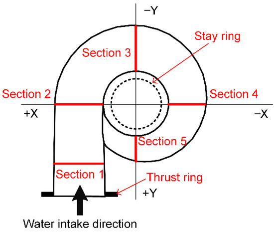 To better understand the relationship between the initial gap and the temporary IWP, five typical cross sections were taken for thorough comparison and analysis. As is shown in Figure 6, section 1 is at the inlet of the straight tube, and sections 2–5 are typical “C” cross sections of +X, −Y, −X and +Y coordinate axes, respectively. Considering the downstream narrowing of “C” cross sections, the structural analysis of SCS can be roughly considered as an axisymmetric problem, and the structural performance of each cross section is primarily influenced by spiral case’s radius and surrounding concrete’s size. Therefore, these chosen cross sections should well represent the overall situation [36].