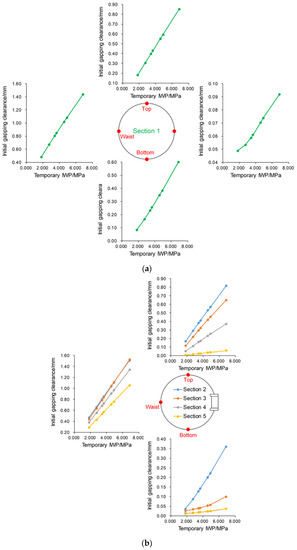 Figure 7 shows the calculated SSC-concrete initial gapping clearance at some representative points at five typical cross sections. An approximate linear relationship between the initial gapping clearance and the temporary IWP can be easily found in most curves, and it indicates that higher temporary IWPs directly lead to larger initial gaps. Moreover, significant unevenness in the distribution of the initial gap can be observed in all sections. In section 1, the gapping clearance at the left waist reaches 1.44 mm when the temporary IWP is chosen equal to the MDP at 6.86 MPa, while the gapping clearance at the right waist is only 0.09 mm at the same time. In sections 2–5, the gapping clearance at the left waist reaches 1.51 mm, 1.53 mm, 1.34 mm and 1.06 mm under the same condition above, respectively.