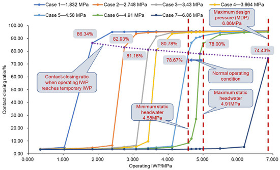 Figure 9 shows the evolution process of the contact-closing ratio of all seven cases. It is shown in the dotted curve that more than 13% of the SSC-concrete contact area remains open when the operating IWP reaches the temporary IWP, and the contact-closing ratio declines with the increase in temporary IWP.