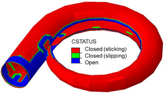The most striking result about case 7 is that only less than three-quarters of the SSC-concrete contact area is closed when the operating IWP reaches the temporary IWP, and Figure 10 shows the SSC-concrete contact status of it. Open status is mainly observed at the straight tube and the pedestal area of the SSC.