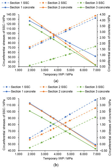 With the increase in temporary IWP, the circumferential stress of the concrete decreases, while the circumferential stress of SSC increases in an approximately linear pattern. When temporary IWP is specified to be equal to 40% of the minimum static headwater (1.832 MPa), the circumferential stress of concrete reaches 3.95 MPa, 4.25 MPa and 3.62 MPa at the top of sections 1–3. Since the characteristic value of the tensile strength of the concrete (C30-grade concrete in the Chinese grading system) is taken as 2.0 MPa in the CMWR design specification [39], the stress level of this case has already been far over the design code. When temporary IWP is specified to be equal to the MDP (6.86 MPa), the circumferential stress of concrete reaches 0.89 MPa, 0.15 MPa and 0.13 MPa at the top of sections 1–3, and no tensile stress is found at the waist of all cross sections.