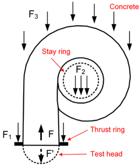 As is shown in Figure 12, the unbalanced hydraulic thrust (F) is balanced with the test head in construction period, and it is shared jointly by the thrust ring (F1), the stay ring (F2) and the concrete (F3) in the operating period [40]. It is obvious that the share percentage of these three parts depends a lot on the IWP-jointly-resisting status.