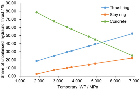 Figure 13 shows the share of unbalanced hydraulic thrust of the thrust ring, the stay ring and the concrete at 6.86 MPa. Under this condition, the value of unbalanced hydraulic thrust is 32.34 MN. It is shown that the share of unbalanced hydraulic thrust of the concrete declines with the increase in temporary IWP. Accordingly, the share of the thrust ring and the stay ring increases with the increase in temporary IWP. When the temporary IWP is specified equal to the MDP (6.86 MPa), the share of the thrust ring and the stay ring reaches 52.43% and 22.23%, respectively. The result proves the feasibility of the current design philosophy for the thrust ring.