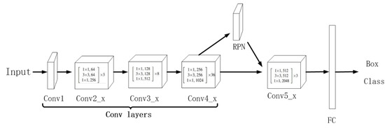 The structure of the Faster RCNN is shown in Figure 2. First, the detection image is reduced to a fixed size and input into the convolutional layers to obtain the feature maps. Compared with the traditional sliding window and selective search, the RPN obtains candidate regions faster. In the RPN, multiple anchors are generated based on the feature maps and then classified to determine which anchors are positive anchors with targets and which are negative anchors without targets. Using the information from all of the bounding boxes combined with the positive anchors’ regression, which detects the object’s bounding box, the proposal layer is obtained. The feature maps and proposals are input into the ROI to extract the proposal feature maps. The proposal feature maps calculate the category for each proposal using the fully connected layer and Softmax and then output the category probability vector. Simultaneously, each proposal is adjusted so that it can regress to a more accurate target bounding box.