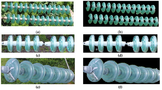The process of removing the background from the insulator image. (a,c,e) are the insulator target images, and (b,d,f) are their corresponding segmented images.