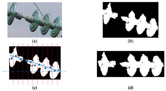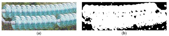 According to the above clustering algorithm, the insulator’s target image can be converted into a binary image, as shown in Figure 5b. There is considerable noise in the obtained binary image, so the open operation is performed to remove the noise. The processed image is shown in Figure 5c. A morphological inspection of the processed binary insulator image determines whether it is defective. To visually show the effect of removing the background, the result of pixel clustering segmentation is mapped back to the original image. That image is shown in Figure 5d.
