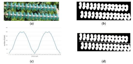 A cutting line is then found to divide the insulators installed side by side into a single row of insulators. The cutting line is a straight line parallel to the insulator. Therefore, fitting the straight line generated in the “binary image rotation” step is used to translate the image. First, the line is moved to the top of the image, and then the number of insulator pixels intercepted each time is recorded. The scan result is shown in Figure 8c, The graphs represent the insulator pixel content at each intercept. According to the scanning result, the position of the cutting line is obtained.