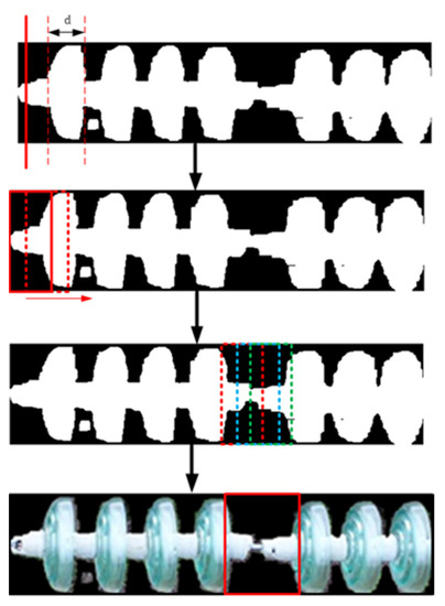 where “l” is the long side of the window, “d” is the short side, and “binary[i][j]” is a pixel in the binary image intercepted by the window. “l” is equal to the short side of the target image, and “d” is determined by the width of the insulator cap. The width of the insulator cap is obtained by scanning the binary image. “P”, the insulator pixel content in an evaluation window, is obtained using this formula. Figure 9 demonstrates the process of detecting missing insulator caps.