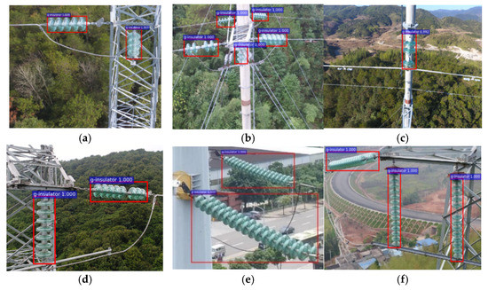 Verification results of insulator defect detection: (a–f) are the defect detection effects of insulators in different transmission towers