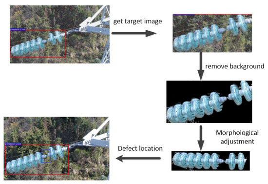 The process of the proposed insulator defect detection method is shown in Figure 1. The transmission line scene is very complex, so regional target detection technology is used to locate the insulator in the detection image. The insulator region in the detection image can be cut out using the information output by regional target detection. To better detect the defect location, the background of the clipped insulator region image is removed. Finally, an insulator defect detection method based on morphology is proposed.