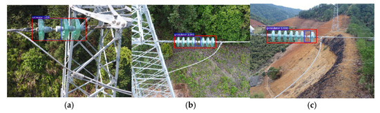 Some defective insulator images detected by our detection algorithm are shown in Figure 13. It can be seen from the figure that the proposed algorithm can accurately detect the defect location of various forms of insulators. So, the proposed defect detection method is suitable for insulators with different spatial characteristics. In addition, when the camera takes pictures at a certain angle, the position of the faulty insulator will be covered by itself. It is impossible to solve these problems only by image processing. In actual transmission line inspection work, insulator “key frame” detection technology is usually used to obtain the best shooting angle of the insulator image. So, this question can be ignored.