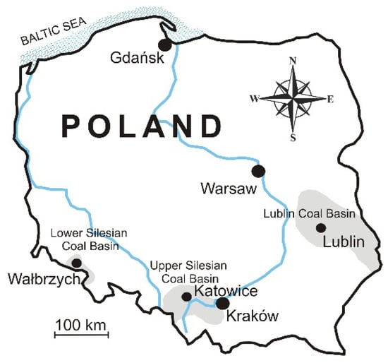 The coal specimens were collected from currently mined hard coal deposits in the Upper Silesian Coal Basin (USCB) in Poland (Figure 1), from longwalls. However, the studied carboniferous coals were of various geologic ages (within the Pennsylvanian–Upper Carboniferous range) (Table 1). Younger coals belonged to the Mudstone Series (Wesphalian A–B), while the older coals belonged to the Upper Silesian Sandstone Series (Namurian B–C). The coal deposits in these Upper Carboniferous cyclothems in the USCB are surrounded by detrital and argillaceous rock. The contribution of coals to the geological sections of both lithostratigraphic members is presented in Figure 2.