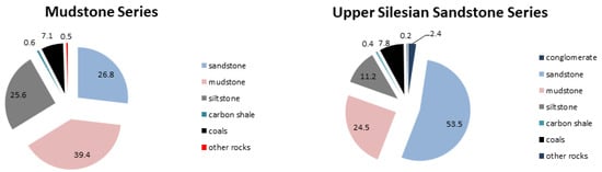 Percentage contribution of coal and surrounding rock in the geological sections of the Mudstone Series and the Upper Silesian Sandstone Series in the USCB in Poland.