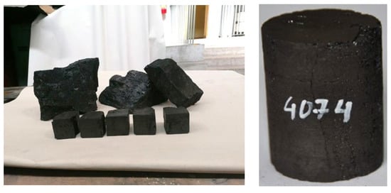Irregular coal specimens collected from workings and regular laboratory specimens (cubic and cylindrical) before testing.