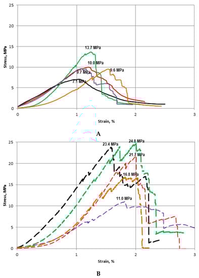 Example stress and strain curves of selected hard coal laboratory specimens of the USCB carboniferous formation: (A) Mudstone Series; (B) Upper Silesian Sandstone Series.