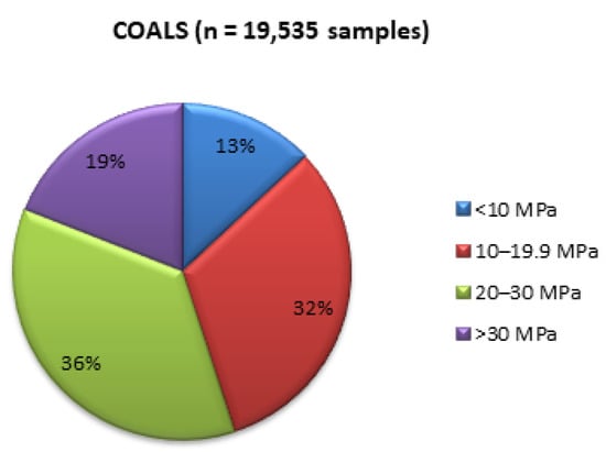 For the conditions of the USCB, it is characteristic that coals with very low compressive strength (below 10 MPa) have a contribution of about 13% in the geological section, whereas clarain with a low compressive strength (10–19.9 MPa) has a contribution of about 20%. The clarain from the Upper Silesian Sandstone Series was characterized by high compressive strength. Such coals have a contribution of about 32% in the geological section, compared to the other tested coals of various lithostratigraphic groups in the USCB [] (Figure 5).