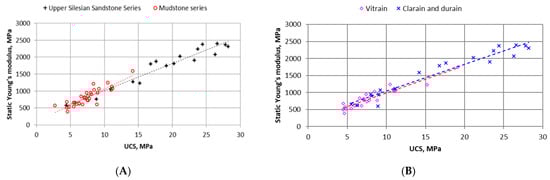 Est = f(UCS) dependence for hard coals: (A) from the Mudstone Series and the Upper Silesian Sandstone Series; (B) lithotypes vitrain, clarain, and durain.