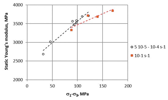 According to experiments in the conditions of conventional triaxial compression (stress condition σ1 > 0, σ2 = σ3 ≠ 0), Figure 7 and Table 8 present the static Young’s modulus as a function of differential stress. Laboratory experiments were conducted at confining pressures of 10, 20, 30, and 50 MPa and at various strain rates: 5 × 10−5 to 10−4 s−1 (rock strain rates in the working environment), and 10−1 s−1 (rock strain rate representative for characteristic values, e.g., for geodynamic phenomena occurring in the mined rock mass and earthquakes (10−2 to 102 s−1) []).
