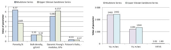 Data analysis (Figure 8) revealed the difference between coals belonging to the two different cyclothems. The Mudstone Series coals were characterized by greater porosity, compared to the coals of older geologic age (the Upper Silesian Sandstone Series). Porosity, as an original parameter with direct relation to the formation conditions of the coal-bearing series, proved to be significant for the variability of the dynamic Young’s modulus and the compressional wave propagation velocity.