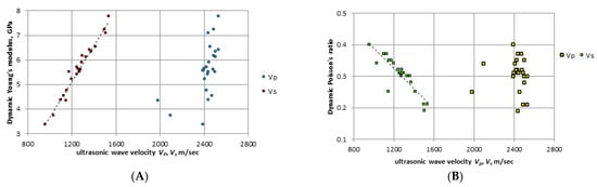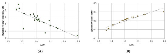 The laboratory test results allowed determination of the linear dependence between the compressional wave propagation and the dynamic Young’s modulus (Figure 9A) and Poisson’s ratio (Figure 9B). The obtained coefficients of determination indicated a very strong correlation in the case of Young’s modulus and a strong correlation for Poisson’s ratio (Table 10). Furthermore, the test results showed no relationship between P-wave velocity and the dynamic moduli of both investigated hard coals. The lack of dependence between the P-wave velocity and the dynamic Young’s modulus is also characteristic of claystone and limestone []. The results of tests conducted on limestone, mudstone, and sandstone by Puskarczyk et al. [] also confirmed a lack of dependence between the compressional wave velocity and the dynamic Young’s modulus and Poisson’s ratio.