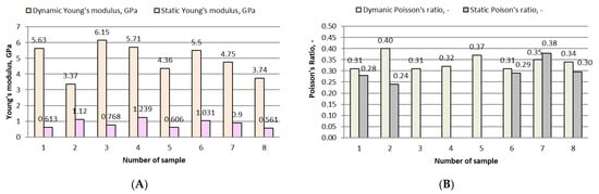 A comparison of static and dynamic Young’s moduli and Poisson’s ratios determined for hard coal on the basis of a number of regular laboratory specimens is shown in Figure 11. Due to technical complications, the Poisson’s ratios of three samples (marked in Table 3 and Figure 11A) could not be designated.