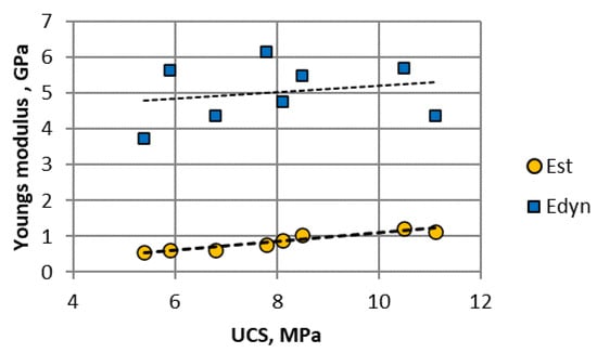 For a small statistical sample, a weak linear correlation was found between UCS and the dynamic Young’s modulus (R2 = 0.05, r = 0.22; SSE = 0.89), in contrast to the Est = f(UCS) dependence, which, despite the size of the set (n = 8), was characterized by a very strong linear correlation (R2 = 0.8959; SSE = 0.09) (Figure 12), similar to that presented in Figure 6A,B for a large statistical sample.