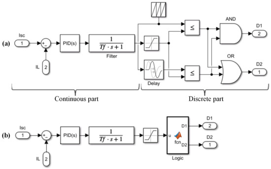 Figure 6a) into a continuous part and a discrete one. The first one includes a PID controller acting so as to mitigate the error being the difference between the reference short circuit current