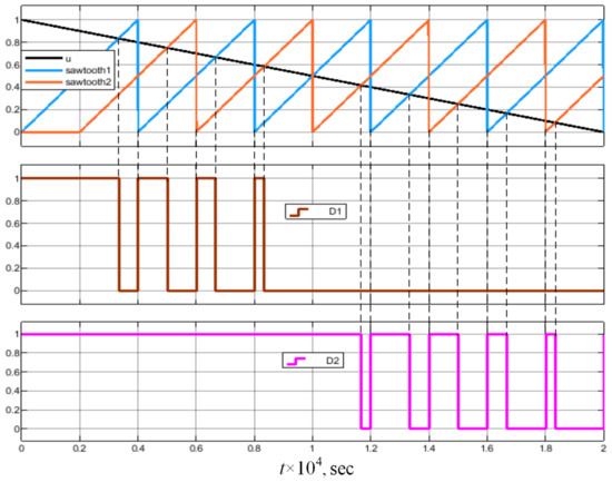 . An aperiodic filter is optional and serves to lower the PID output signal ripple. The filter output is limited within the range from 0 to 1. Then, this signal is compared to a sawtooth with a frequency of 25 kHz and its delay by a half of period. This is accomplished by relational operators. Then, the comparison resulting signals through the logical operators form control pulses