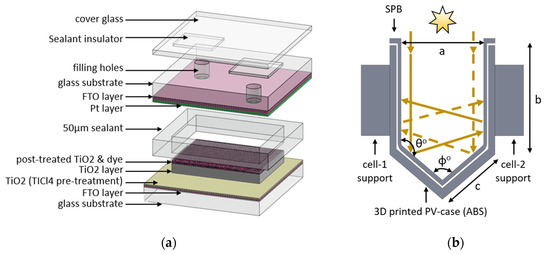Figure 1b depicts a cross section of the geometry as an alternative light trap for the improvement of DSSCs such as dye sensitized solar cells. This kind of cell case (DSSC-case/PV case) was designed and sketched by a CAD program and built by a 3D printer with ABS material as well. SPB was stretched into the same design geometry and was integrated inside the PV case. Two prominences were designed to the left and to the right of the PV case to support the DSSCs. Photoanodes were exposed to radiation through two internal windows with the same surface area, while appropriate pieces of SPB were placed at the back of the DSSC cells as a light surface reflection. The light path of the radiation into the PV case is also shown in Figure 1b. As the distance (a) between the cells was 1.4 cm (upper area 2.52 cm2) and the vertical length (b) was at 2 cm equal to the cells’ height and they were kept constant, the internal angles θο and φο as well as the (c) length (Figure 1b) were calculated for the maximum light path before the photons escaped from the PV case. The main objective was the absorption of the energy from each cell gradually every time photons impinged on them.