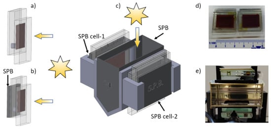 (a) Standalone cell, (b) SPB cell, (c) PV case: double cell architecture, (d) DSSCs; actual size, (e) experimental architecture (PV case) with mounted DSSCs.