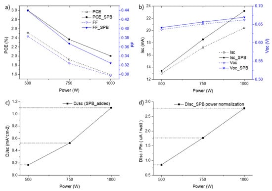 The greatest improvement, however, was observed when these devices were illuminated at a lower power. Figure 4a,b depict the effect of the illumination power (500, 750 and 1000 W/m2) in devices with and without SPB, demonstrating in both cases the severe performance drop upon increasing the input power. Specifically, PCE dropped by 36% between 500 and 1000 W/m2, FF dropped by 22%, while Voc marginally increased by 4%.