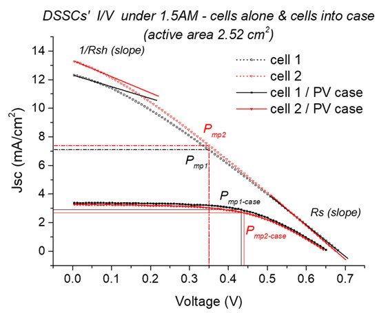 DSSCs’ raw data under 1.5 AM—cell1, cell2: I/Vs of alone cells, cell1/PV case, cell2/PV case I/Vs when the cells are placed into the PV case.
