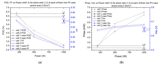 The results of the electrical characterization under variable power densities (200, 500, 1000 W/m2) of the cells as standalone and in the PV case are also presented in Figure 6. The values of the corresponding parameters are shown in Table 3.