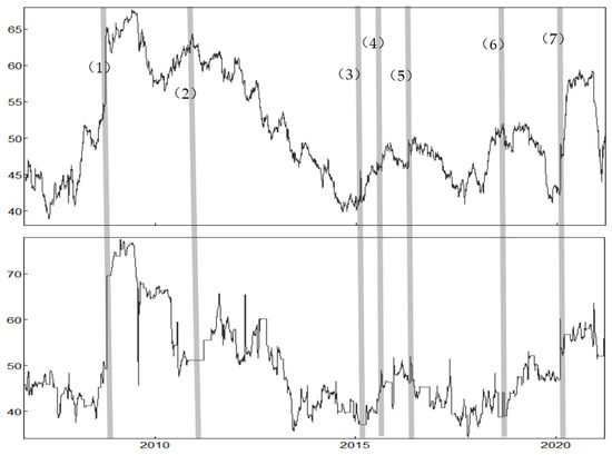 The total volatility spillover of the rolling sample. Notes: (1) The top figure is based on the logarithmic yield and the bottom figure is based on VaR; the length of the forecast is 10 days and the rolling window is 200 days. (2) Event (1): In August 2008, the international financial crisis began to lose control, and many large financial institutions closed or were supervised by the government; Event (2): On 11 March 2011, a magnitude 9.0 earthquake and tsunami occurred in Japan; Event (3): On 10 February 2015, international metals prices plunged 7.2% during the flash crash of the stock markets; Event (4): In August 2015, a major stock market crash in China occurred; Event (5): In June 2016, UK Brexit referendum was approved; Event (6): On 31 August 2018, China’s domestic food prices increased by 25.2% daily; Event (7): In March 2020, the World Health Organization declared COVID-19 outbreak a pandemic.